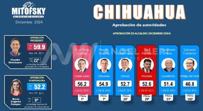 Marco Bonilla cuenta en Chihuahua capital con una aprobación del 54.9% de sus ciudadanos. Ocupa el séptimo lugar nacional del ranking de alcaldes mejor valorados al corte de diciembre.