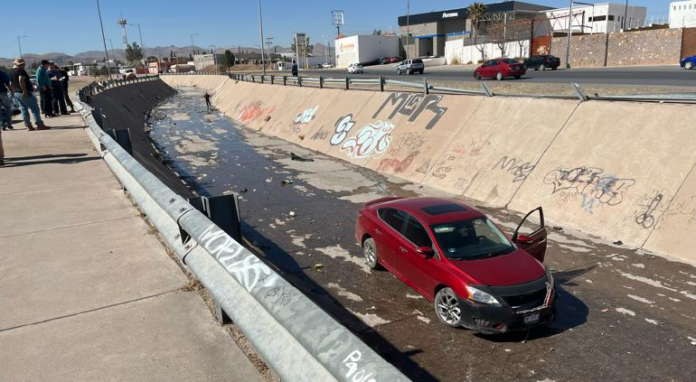 Salió del camino y brincó la valla metálica de contención, cayendo el Sentra al interior del canal con sus cuatro llantas sobre el suelo.