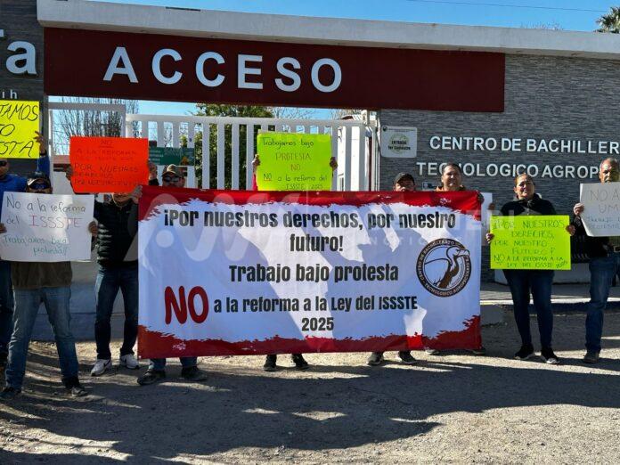 Cientos de docentes se concentraron en el centro de la ciudad de Delicias para manifestarse en contra de la reforma a la Ley del Instituto de Seguridad y Servicios Sociales de los Trabajadores del Estado (ISSSTE) 2025. La protesta se llevó a cabo de manera pacífica, con los maestros colocando pancartas y lonas con lemas como «¡Por nuestros derechos, por nuestro futuro!», «Trabajo bajo protesta» y «No más descuentos a nuestro sueldo».
