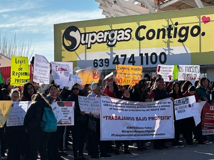 La mañana de este lunes, maestros y docentes de Delicias se manifestaron a las afueras del estadio Delicias, donde se llevaba a cabo la conmemoración por el día dela bandera por parte de alumnos de nivel básico de la ciudad. La manifestación fue una muestra de descontento con la nueva reforma a la ley del ISSSTE, que afecta a sus beneficios.