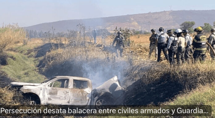 Una persecución entre civiles armados y la Guardia Nacional desató una balacera en Zapotlanejo, dejando un auto en llamas y al menos 50 disparos escuchados por los vecinos.