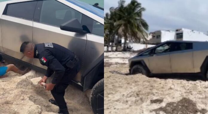 Por medio de redes sociales se compartió como una Cybertruck se quedó enterrada en la arena a pocos metros del mar, mientras un elemento de la policía estatal de Yucatán, así como otra persona peleaban para poder destrabar la camioneta.