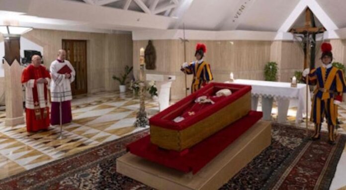 El féretro fue fotografiado custodiado por dos guardias suizos en la capilla de la Residencia Santa Marta, donde vivió Francisco.