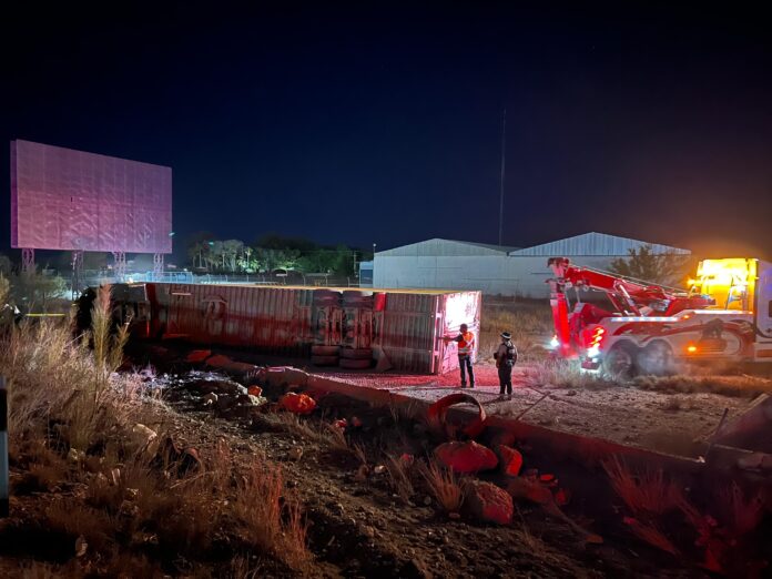 En la madrugada de este viernes, un tráiler volcó en un predio tras salirse de la Carretera Federal 45, en dirección sur-norte, cerca del puente del Panteón de Meoqui. El conductor perdió el control, causando que la unidad se precipitara hacia su lado derecho, arrancando una valla metálica y una malla ciclónica antes de volcar.