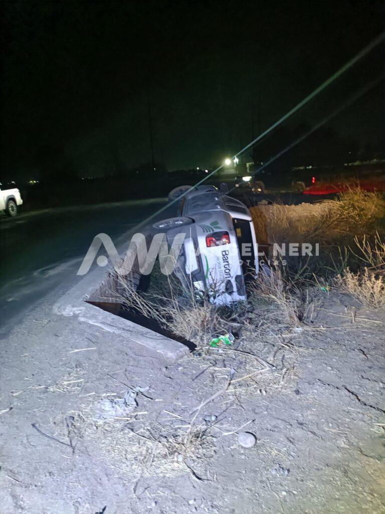 Una camioneta de la empresa Barton Miller volcó la noche del miércoles en la carretera Delicias-Ortiz, frente al restaurante El Remar, después de que el conductor perdiera el control al intentar cruzar un pequeño puente y cayera a un dren contiguo a la vía.