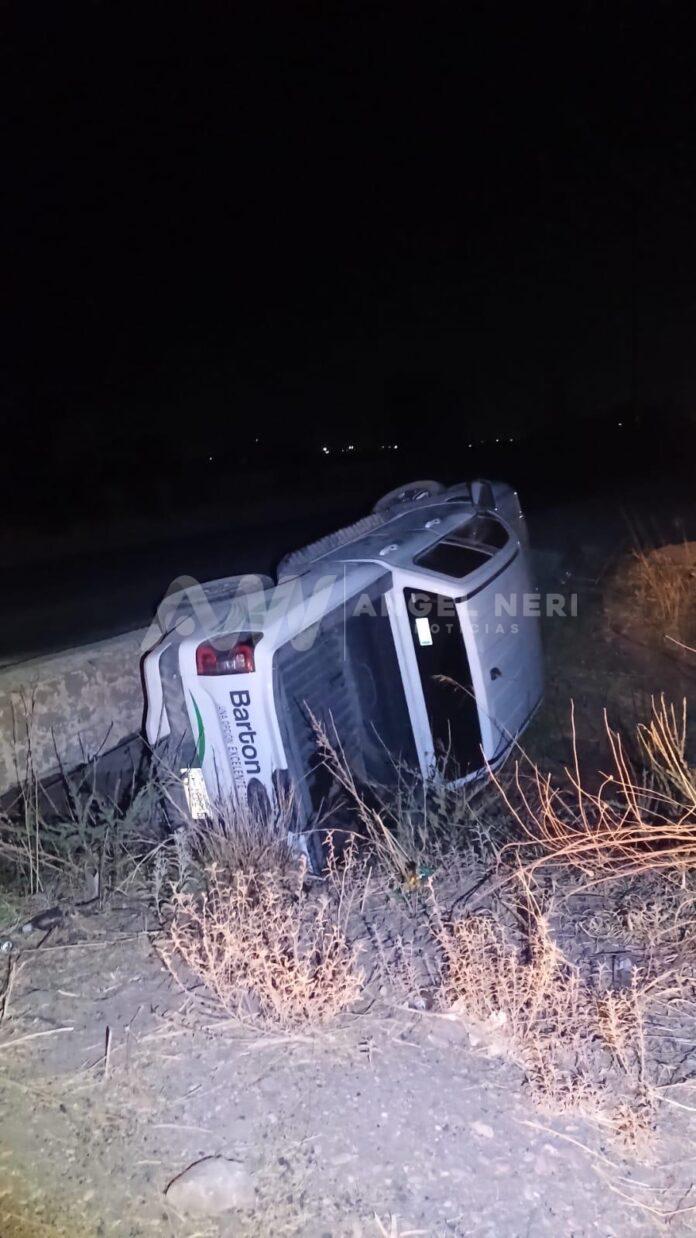 Una camioneta de la empresa Barton Miller volcó la noche del miércoles en la carretera Delicias-Ortiz, frente al restaurante El Remar, después de que el conductor perdiera el control al intentar cruzar un pequeño puente y cayera a un dren contiguo a la vía.