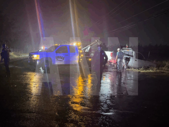 Un conductor perdió el control de su camioneta debido a las fuertes lluvias, terminando dentro de un dren a un costado de la carretera que conduce a Rosales.