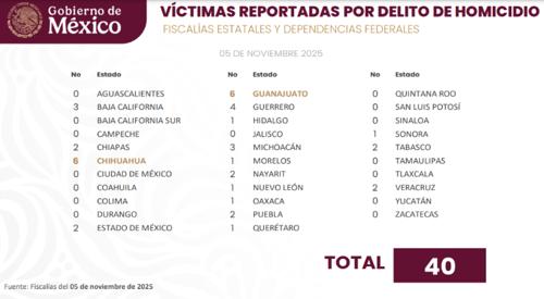Mientras que a nivel nacional reportaron 40 víctimas de homicidio, lo que está por debajo del promedio del mes de lo que va de noviembre (56.0), destacaron sólo a los dos estados mencionados por sus altas cifras.