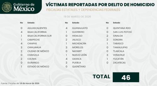 Específicamente, el reporte correspondiente al 19 de marzo contabiliza a nivel nacional 46 víctimas por delito de homicidio.